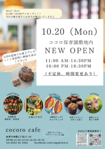 2025.10.19 お知らせ cocoro cafeオープンします♪ 月曜日から、敷地内でオープンします。 OPEN 11:30~14:30, 16:00~18:30 不定休 tel:0952-65-3001 担当:寺本